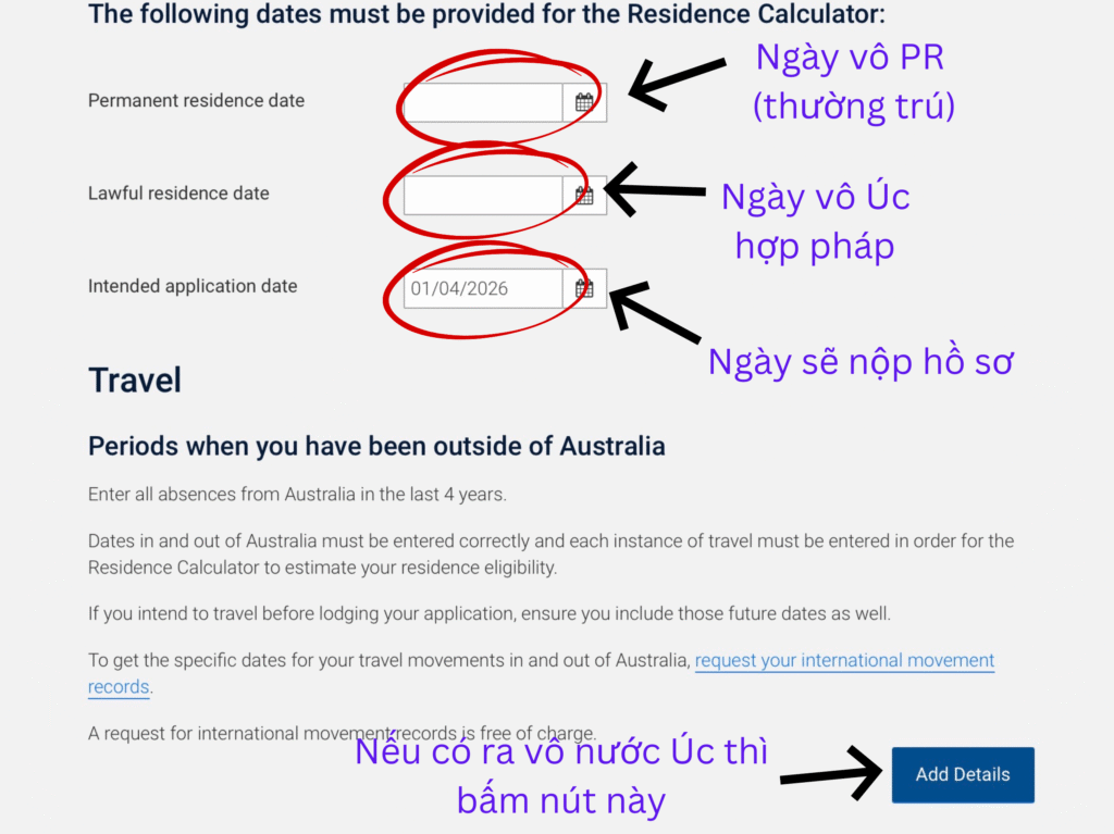 Đây là phần thời gian anh chị đi ra vô nước Úc. Sau khi đầy đủ thông tin rồi thì anh chị bấm vô chữ Calculate
